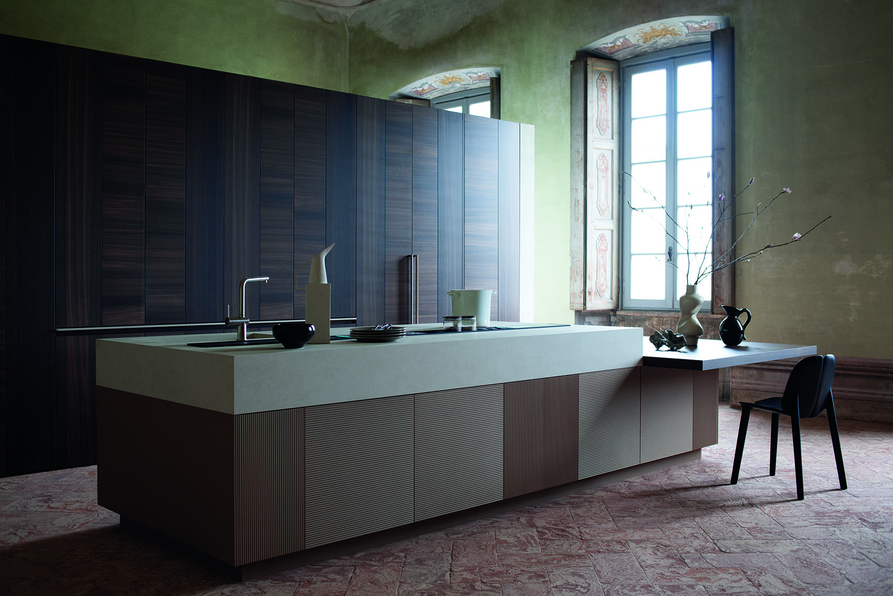 Tangram bestaat uit elementen met vijf verschillende radii die naar wens kunnen worden gecombineerd met ook, rechte elementen, en zo een keukeneilanden te bouwen met ongebruikelijke vormen. Composities tegen de muur of zelfs oplossingen die zich om hoeken heen wikkelen. Om de vloeibaarheid van Tangram te accentueren, is het mogelijk de fronten van de kasten te voorzien van een speciaal decoratief detail: een driedimensionaal element genaamd Groove, bestaande uit een reeks verticale insnijdingen die een onregelmatig patroon creëren, ontworpen om de verbinding tussen de modules te verbergen en een eenheidsperceptie te garanderen. van de regeling.