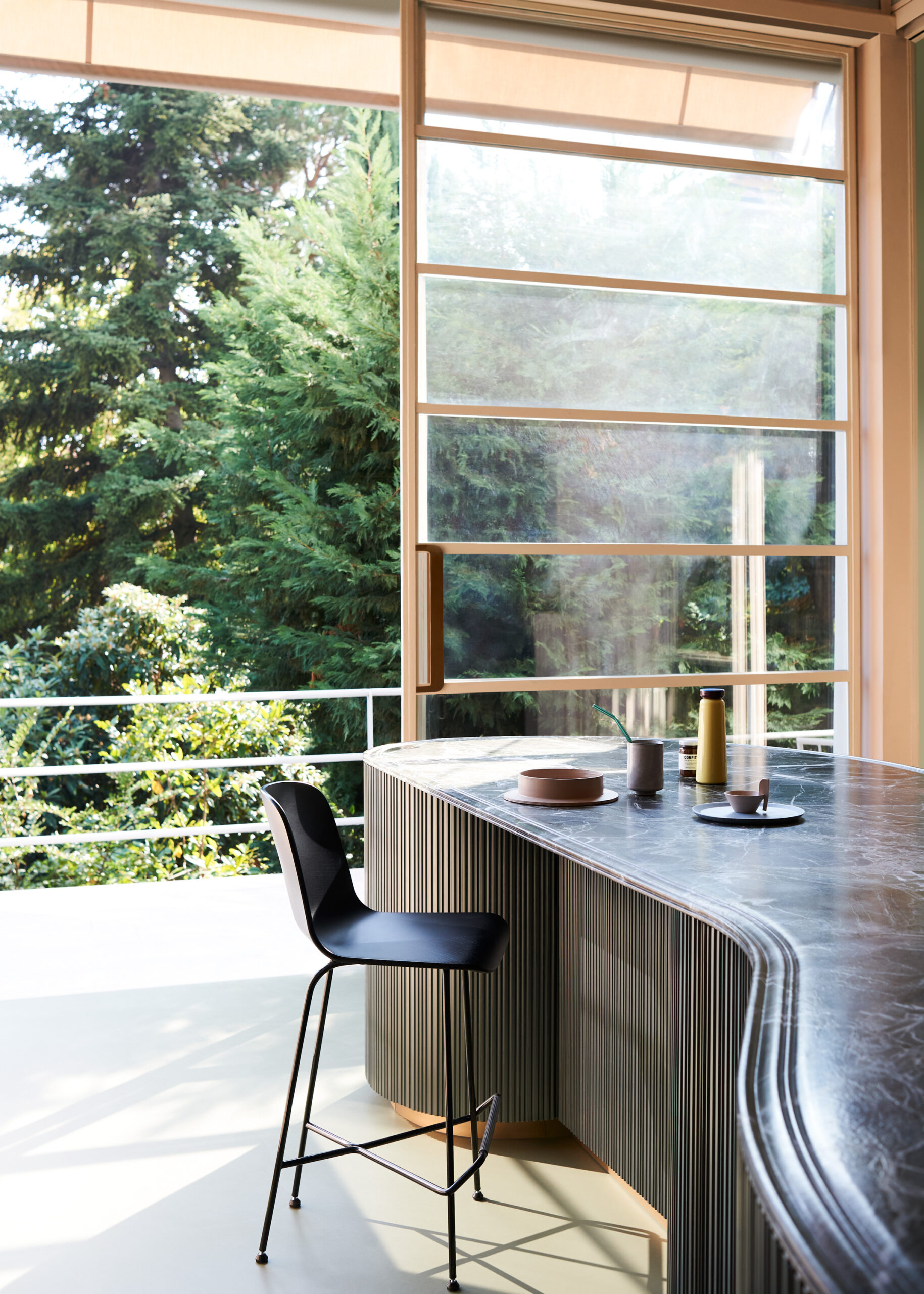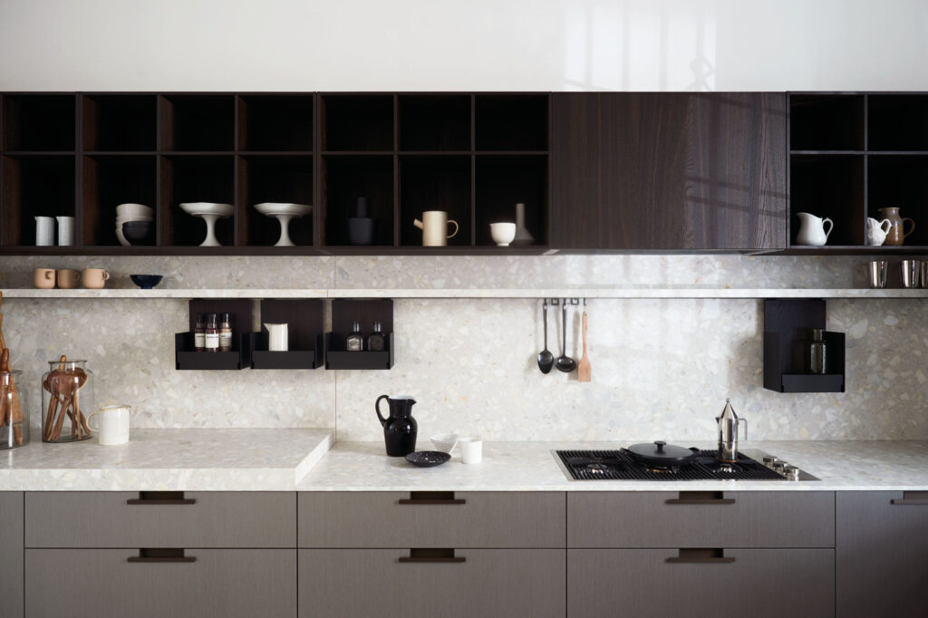 Tangram consists of elements with five different radii that can be combined as desired with also, straight elements, building kitchen islands with unusual shapes. Compositions against the wall or even solutions that wrap around corners. To accentuate the fluidity of Tangram, it is possible to add a special decorative detail to the cabinet fronts: a three-dimensional element called Groove, consisting of a series of vertical incisions that create an irregular pattern, designed to hide the connection between the modules and ensure a unitary perception. of the arrangement.